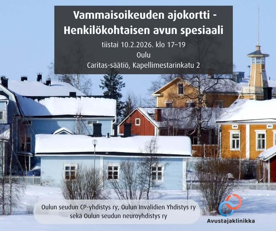 Avustajaklinikka sekä Oulun seudun CP-yhdistys ry, Oulun Invalidien Yhdistys ry ja Oulun seudun neuroyhdistys ry järjestävät yhteistyössä Vammaisoikeuden ajokortti - Henkilökohtaisen avun spesiaali…